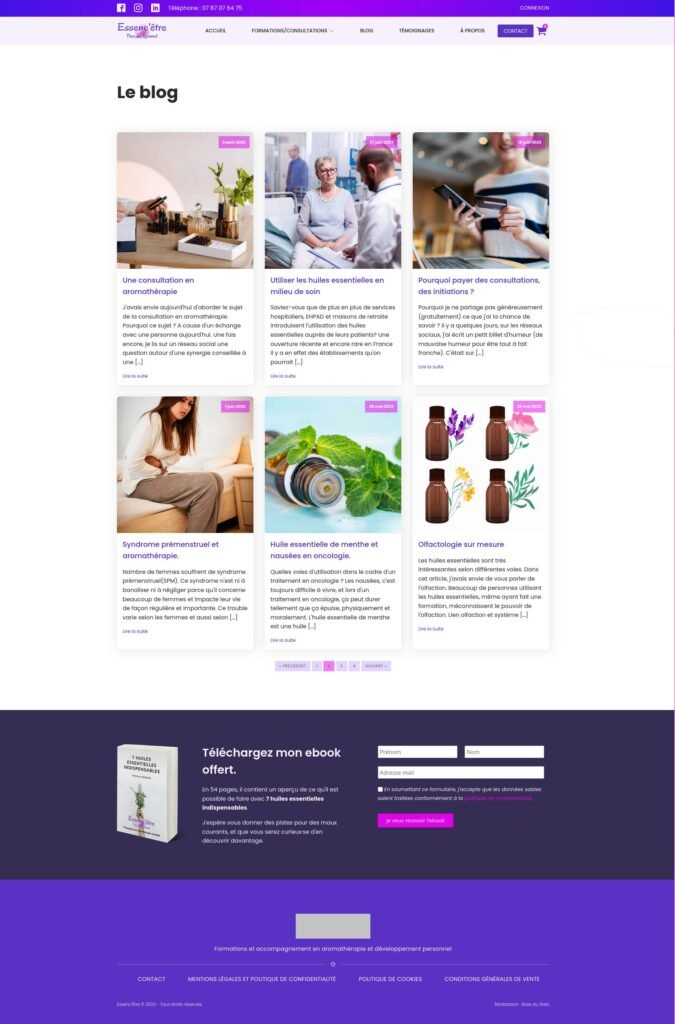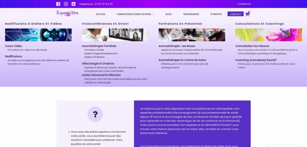 Création et développement du site pour cette société fondée par Pascale Renaud, formatrice et coach en aromathérapie. Essenc’Être propose des formations sous forme de visioconférences à distance ou en présentiel ou sous forme de vidéos enregistrées, ainsi que des consultations sur mesure en aromathérapie scientifique et familiale. Les internautes peuvent s’inscrire à ces formations ou consultations et/ou acheter les vidéos enregistrées.